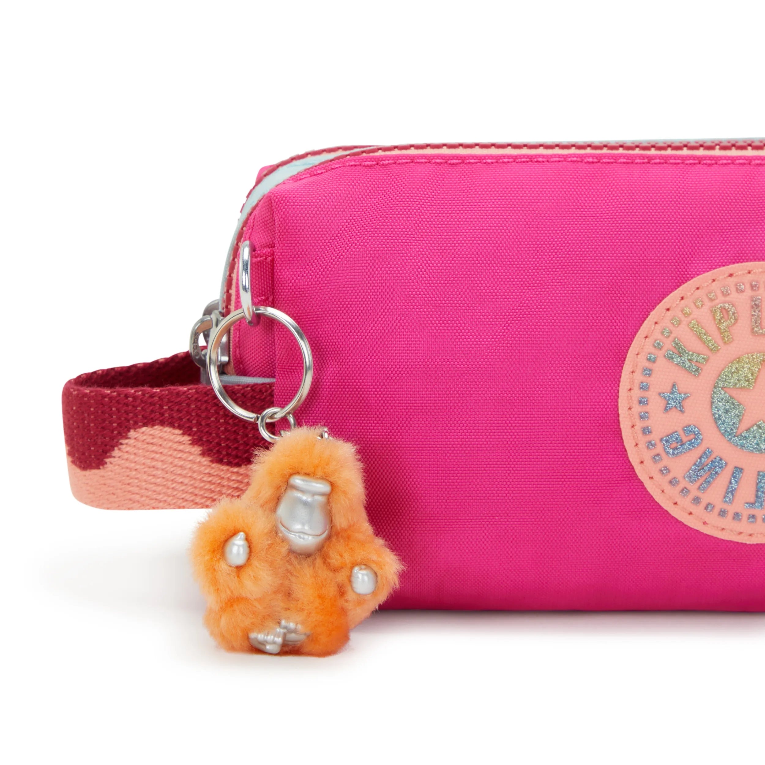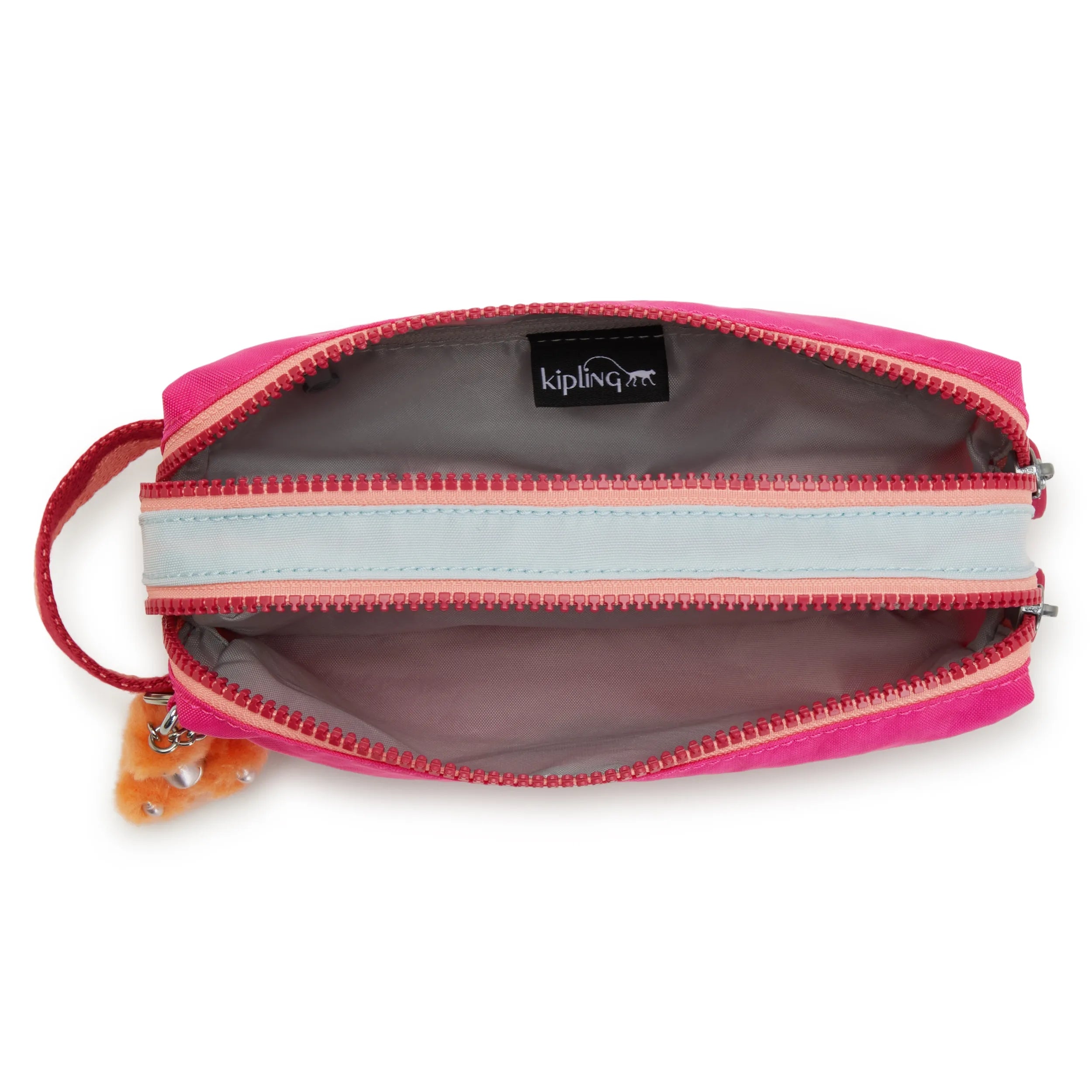 The pouch with two. separate compartments. Use it for pens and pencils. art supplies. tech supplies. or makeup.